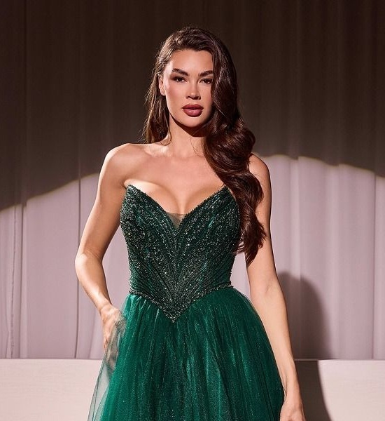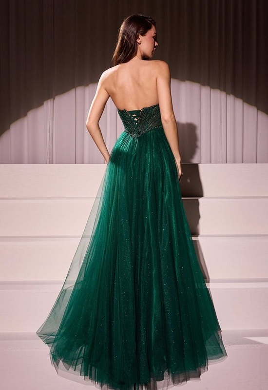 Step into the spotlight in this enchanting A-line dress, featuring a pointed strapless neckline and exquisite beaded details that catch the light beautifully.