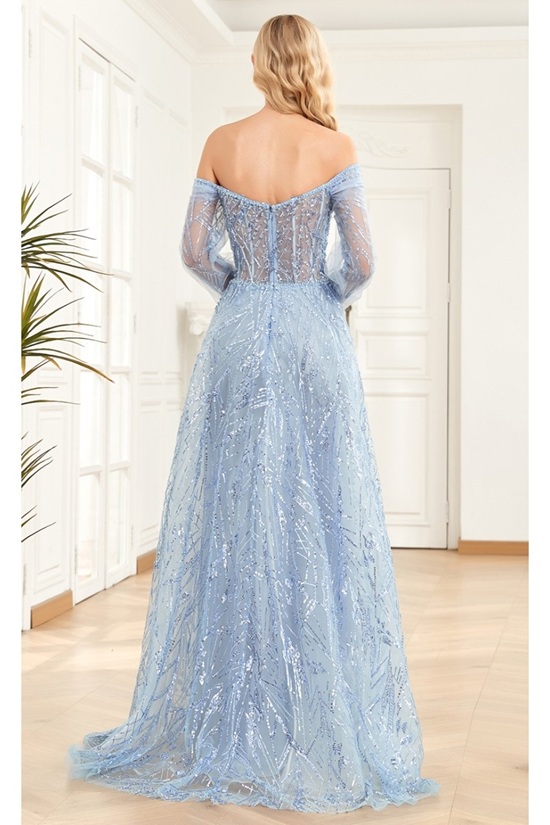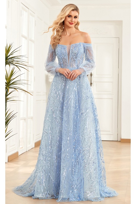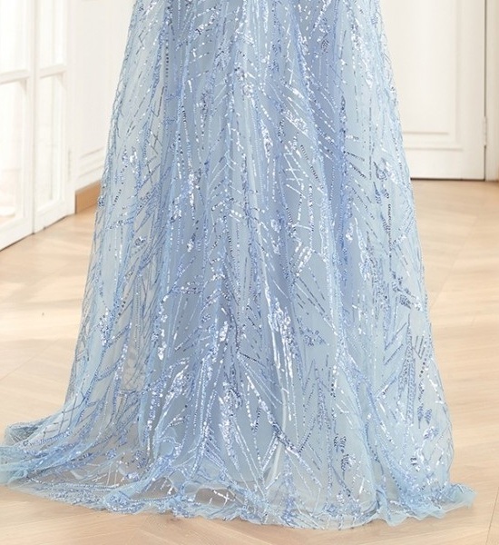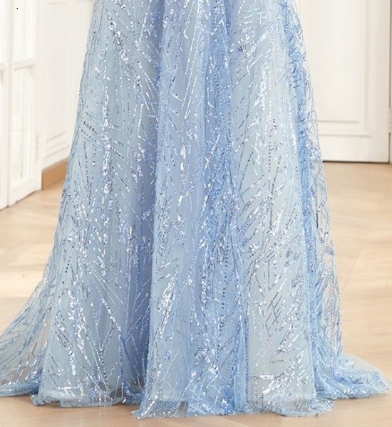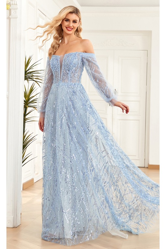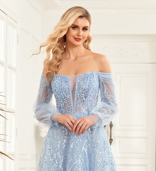 Featuring a lovely v neckline, the stunning a line dress is accompanied by flowered long sleeves.