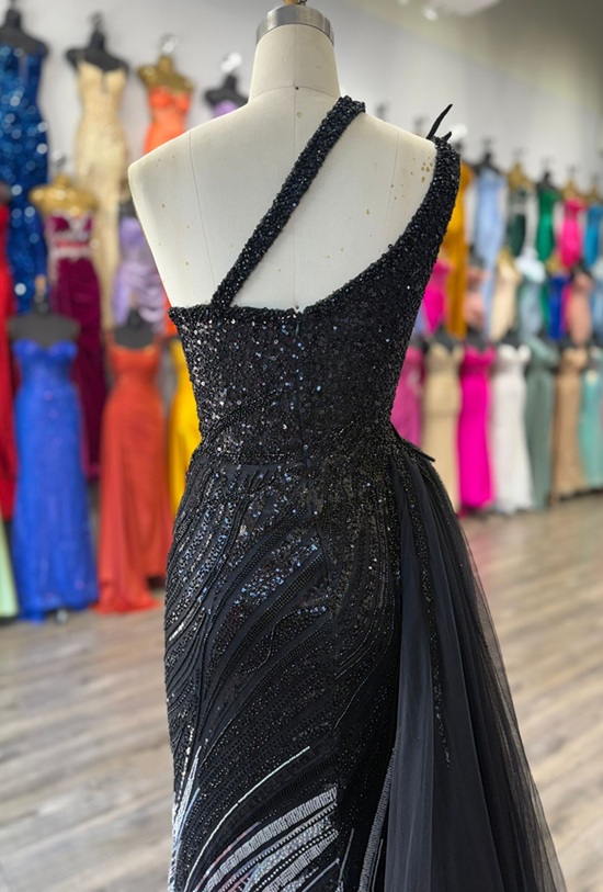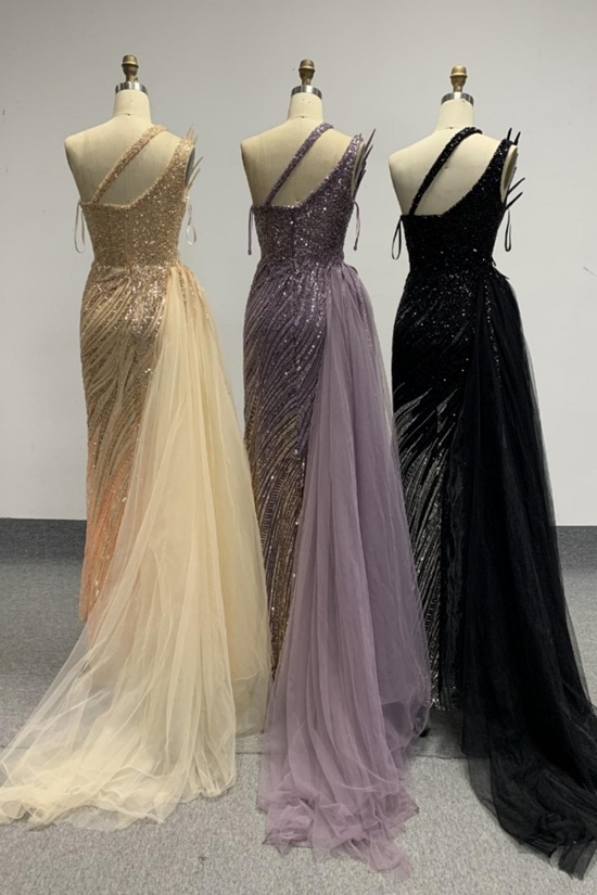 The sheer tulle overskirt gracefully reveals a glimpse of sophistication, and a leg slit adds a dash of allure to every step.