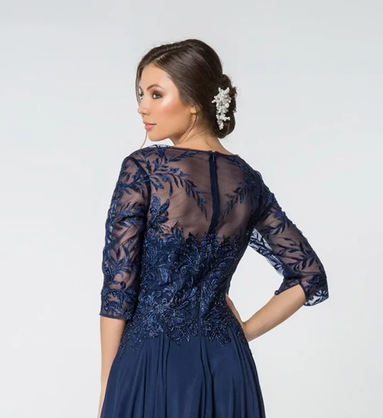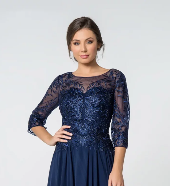 Embroidered Bodice 3/4 Mesh Sleeve Chiffon Long Dress