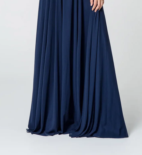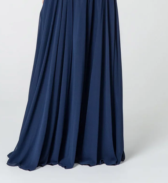 Soft-airy chiffon A-line dress embellished with sophisticated embroidery and jewels on bodice.