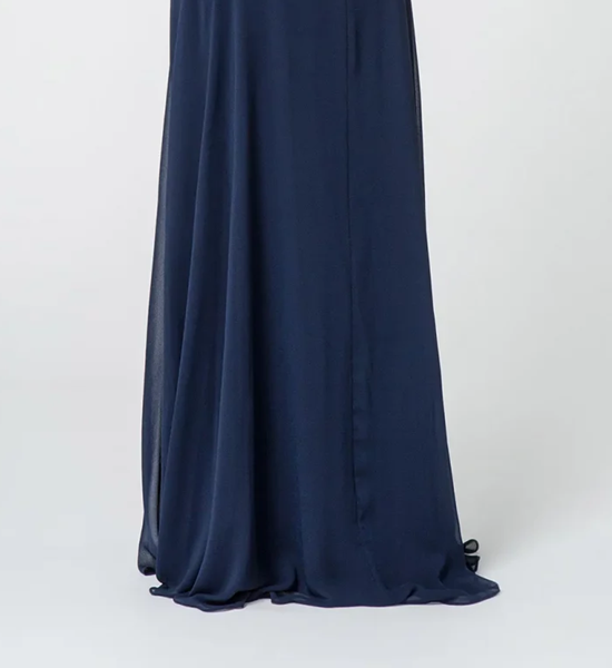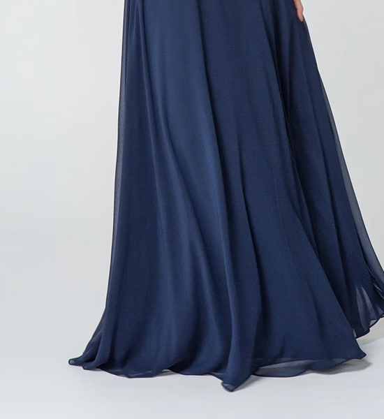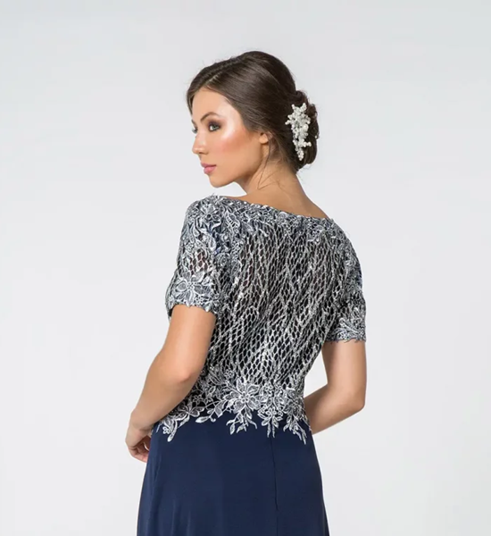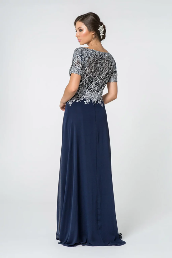 Lace Embellished Illusion V-Neck Long Dress Metallic embroidered bodice and back with illusion V-neckline.