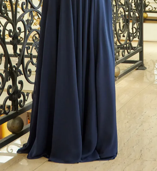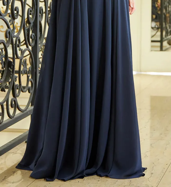 The mesh bodice transitions into the chiffon skirt smoothly by using the embellish