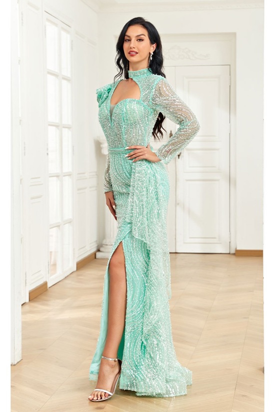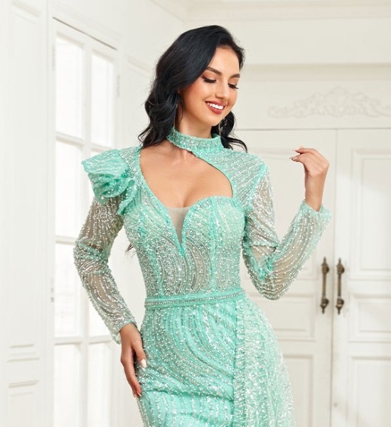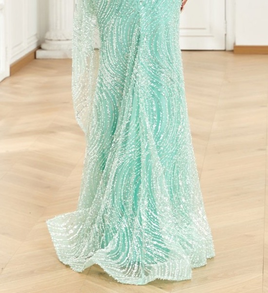 Highlighting the exquisite sequin that beautifully decorates the entire gown in a meticulous pattern.