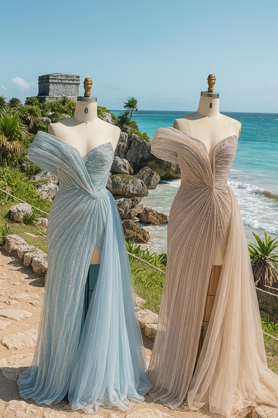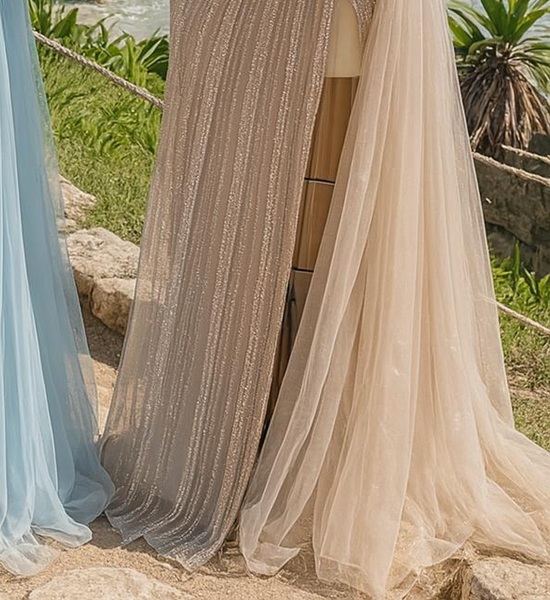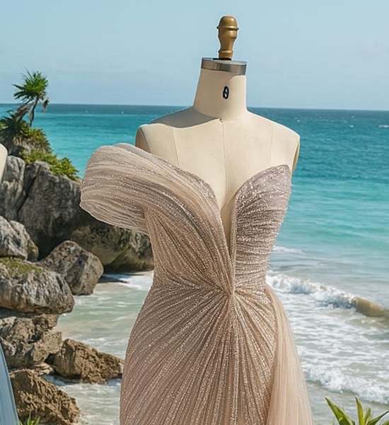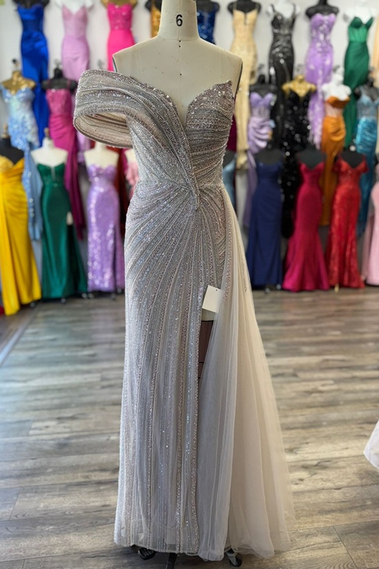 The shimmering beaded motif flows gracefully over delicate tulle, while the leg slit adds a modern touch of allure.