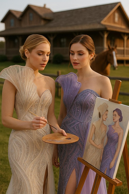 featuring an asymmetrical pleated fan bodice that adds an artistic flair.