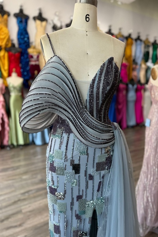 This exquisite fitted dress features an asymmetrical neckline with an elegant off-the-shoulder design and long,