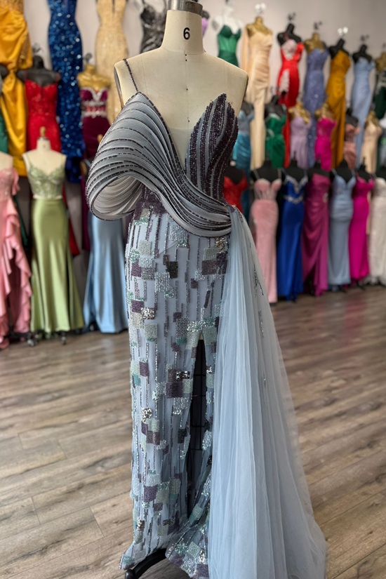 Crafted from beaded tulle over nude lining, the fitted bodice flows into a sleek sheath skirt, with a tasteful leg slit for added movement.