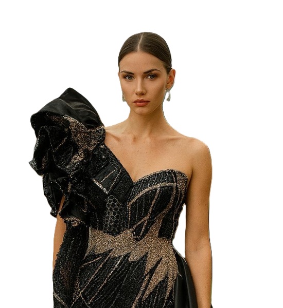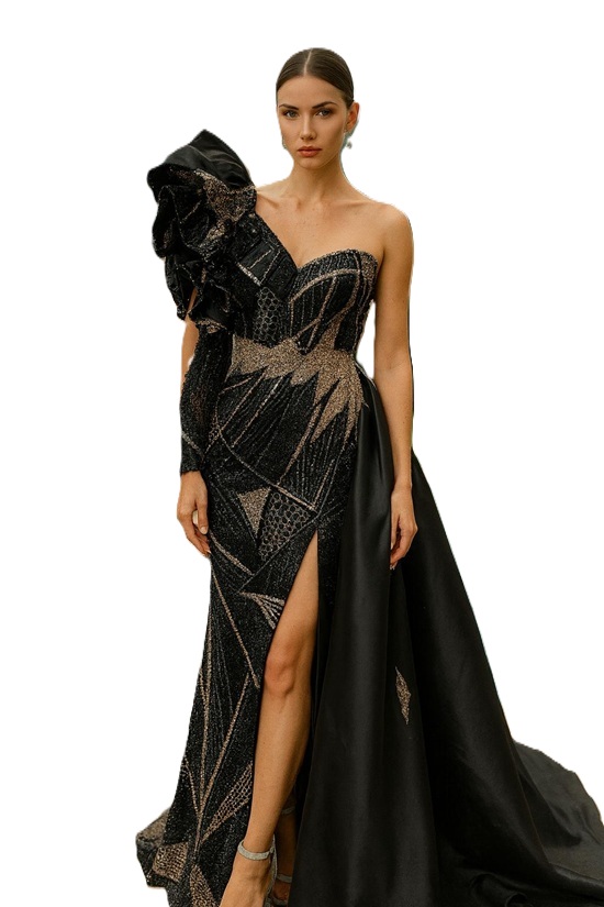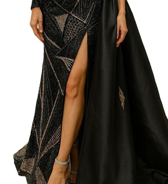 The pearl-beaded tulle over a soft lining adds a touch of luxury, while the wrap leg slit ensures graceful movement.