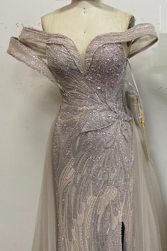CONTENTS | Off the shoulder sweetheart neckline, beaded details, leg slit & overskirt |