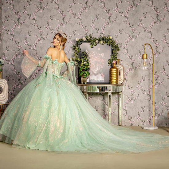 3-D Flower Jewel Sheer Bodice Mesh Ball Gown w/ Long Sleeves