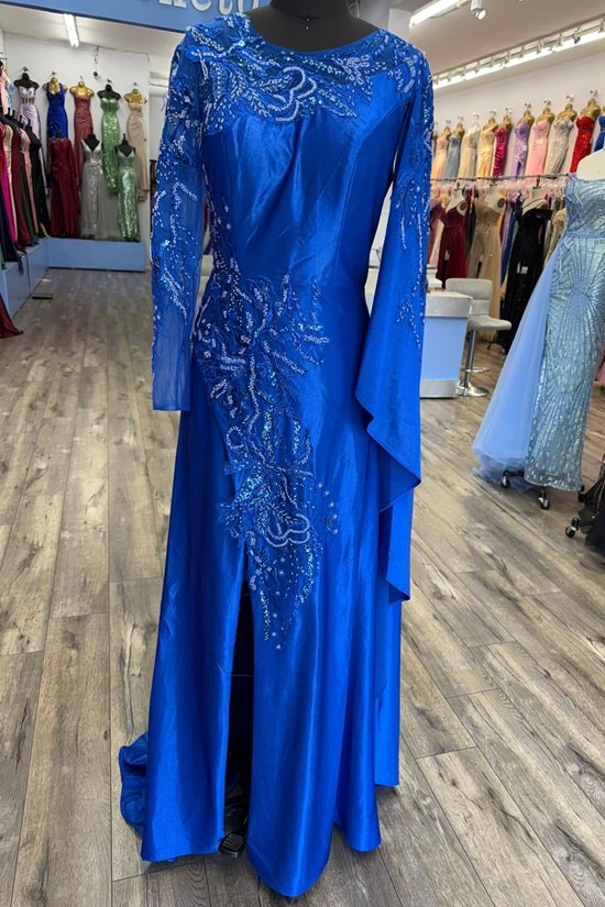 CONTENTS | Illusion neckline with long sleeves, appliqued bodice, leg slit & pleated hiplin |